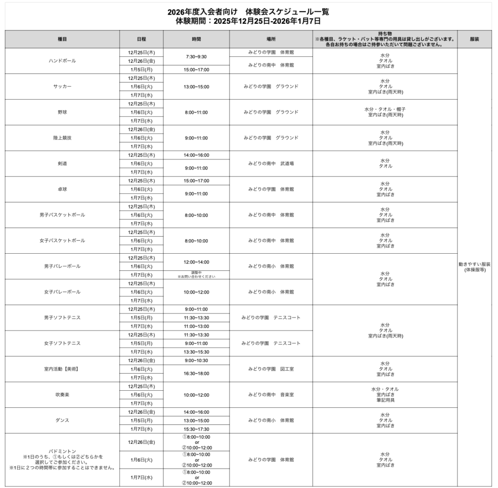 ・各種目の体験可能日は申し込みフォームをご確認ください。(大会・試合等のスケジュールの関係上、各種目で体験可能日が異なります。)